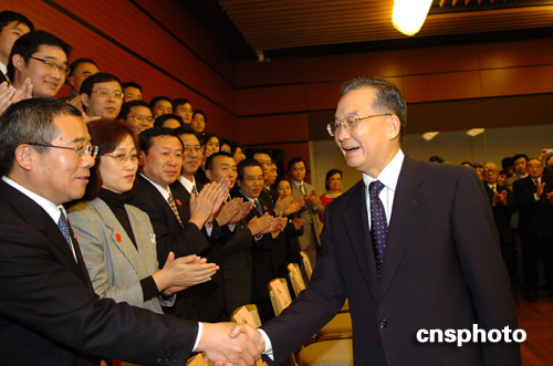12月13日晚,正在日本福岡出席中日韓三國領(lǐng)導(dǎo)人會(huì)議的中國總理溫家寶親切接見了當(dāng)?shù)厝A人華僑及中國駐日使館和駐福岡總領(lǐng)館人員,鼓勵(lì)大家面對(duì)世界性的金融和經(jīng)濟(jì)危機(jī),要有戰(zhàn)勝困難的決心。 中新社發(fā) 朱沿華 攝