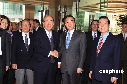 12月19日中午,中國(guó)國(guó)民黨主席吳伯雄一行乘直航包機(jī)抵達(dá)上海,準(zhǔn)備出席將于二十日至二十一日在上海舉行的第四屆兩岸經(jīng)貿(mào)文化論壇。中共中央臺(tái)辦主任王毅在香格里拉酒店迎候吳伯雄一行。中新社發(fā) 潘索菲 攝