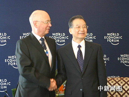 當(dāng)?shù)貢r間一月二十八日中午,中國總理溫家寶在瑞士達(dá)沃斯會見世界經(jīng)濟(jì)論壇主席施瓦布(左)。施瓦布對溫家寶出席本次論壇年會表示熱烈歡迎。張朔 攝