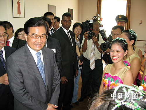 正在毛里求斯訪問的中國(guó)國(guó)家主席胡錦濤,當(dāng)?shù)貢r(shí)間十七日下午來到毛里求斯中國(guó)文化中心參觀。圖為他與舞蹈班學(xué)員親切交談,鼓勵(lì)她們學(xué)好中國(guó)舞蹈。中新社記者 齊彬攝