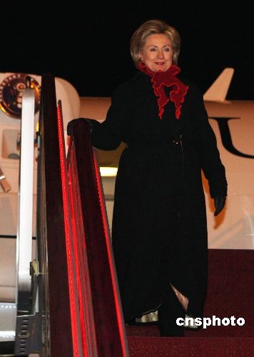 2月20日晚7時40分,美國新任國務卿希拉里·克林頓乘坐專機抵達北京首都國際機場,開始對中國進行訪問。中國是希拉里·克林頓此次亞洲“傾聽之旅”的最后一站,也被外界認為是她此次訪問的“壓軸戲”。中新社發(fā) 任晨鳴 攝