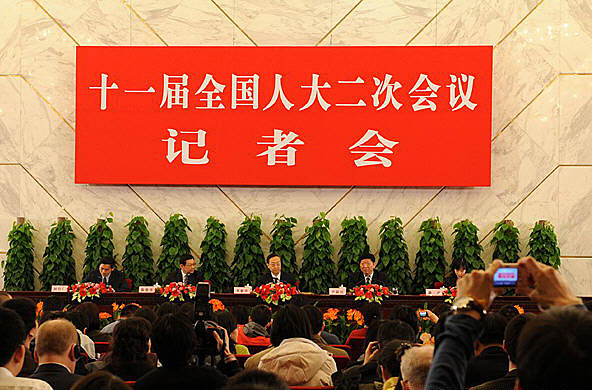 3月10日,十一屆全國人大二次會議舉行記者會,工業(yè)和信息化部部長李毅中、人力資源和社會保障部部長尹蔚民、商務部部長陳德銘答記者問。陳樹根 攝