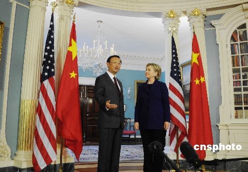 正在美國(guó)訪問(wèn)的中國(guó)外交部長(zhǎng)楊潔篪當(dāng)?shù)貢r(shí)間三月十一日在華盛頓會(huì)見(jiàn)了美國(guó)國(guó)務(wù)卿希拉里。希拉里表示,此前她對(duì)中國(guó)的訪問(wèn)富有成果,她對(duì)中國(guó)外長(zhǎng)這么快進(jìn)行回訪表示高興。中新社發(fā) 邱江波 攝
