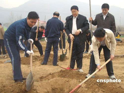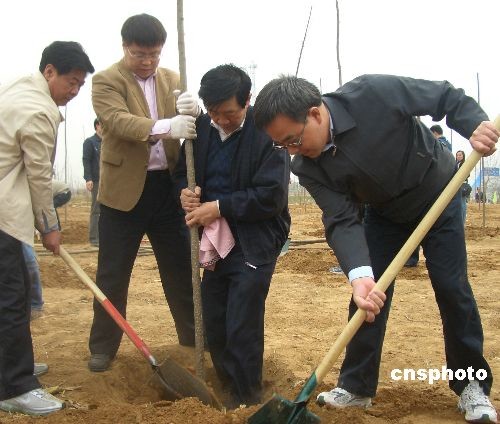 2009年3月21日,河北省及石家莊市黨政軍領(lǐng)導(dǎo)及省市四大辦公機(jī)關(guān)干部、部隊(duì)官兵1900人,在石家莊市鹿泉市山前大道韓莊生態(tài)林業(yè)基地,建設(shè)“省級(jí)領(lǐng)導(dǎo)紀(jì)念林”、“市級(jí)領(lǐng)導(dǎo)紀(jì)念林”、“駐石部隊(duì)紀(jì)念林”100多畝,栽植速生楊樹(shù)12000株,再一次掀起了省會(huì)造林綠化高潮。中新社發(fā) 俱凝搏 攝