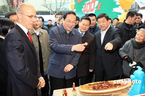 3月27日,2010年上海世博會倒計(jì)時400天,上海市舉行一系列發(fā)布與紀(jì)念活動。中共中央政治局委員、上海市委書記俞正聲參加迎世博會倒計(jì)時400天活動時,觀看服務(wù)行業(yè)技能展示。中新社發(fā) 湯彥俊 攝