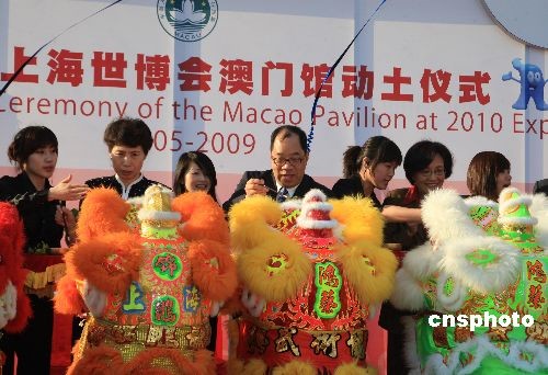 5月8日,2010年上海世博會澳門館舉行動土儀式。澳門特別行政區(qū)經(jīng)濟(jì)財政司司長譚伯源、中央人民政府駐澳門特別行政區(qū)聯(lián)絡(luò)辦公室副主任高燕、上海世博會執(zhí)行委員會專職副主任鐘燕群等為儀式主禮,來自澳門的立法議員、人大代表、工商界以及國際商會代表等超過150人出席儀式。澳門館─“玉兔宮燈”位于中國館區(qū),主體建筑高19.99米,寓意澳門回歸的年份1999,別具意義。中新社發(fā) 潘索菲 攝