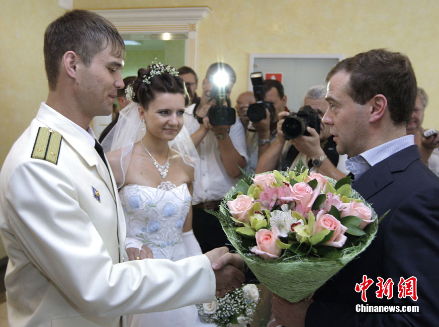7月1日,俄總統(tǒng)梅德韋杰夫在遠(yuǎn)東視察時(shí),參觀了當(dāng)?shù)匾惶幓橐龅怯浱帲蔀槿龑?duì)新人的婚禮見證人,并給他們送上了非常貴重的禮物。