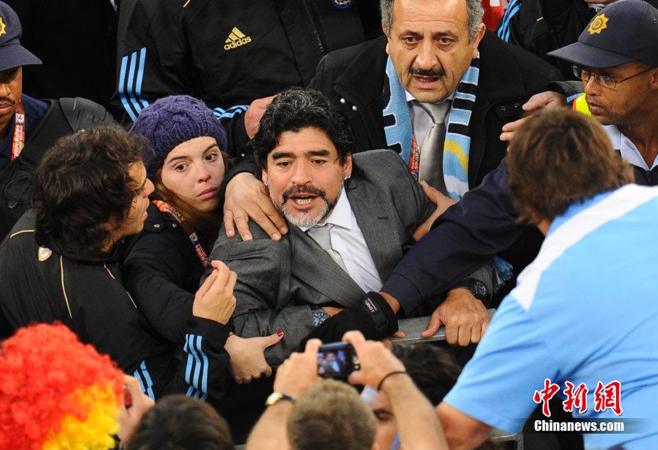 南非世界杯阿根廷與德國(guó)隊(duì)的比賽結(jié)束后,瘋狂的德國(guó)球迷對(duì)馬拉多納進(jìn)行了辱罵和奚落,急脾氣的老馬轉(zhuǎn)身沖向看臺(tái)與球迷理論,他更是要爬上看臺(tái)親手教訓(xùn)這些球迷。好在大女兒達(dá)爾瑪和阿根廷教練組成員及時(shí)前往制止,否則后果將不堪設(shè)想。