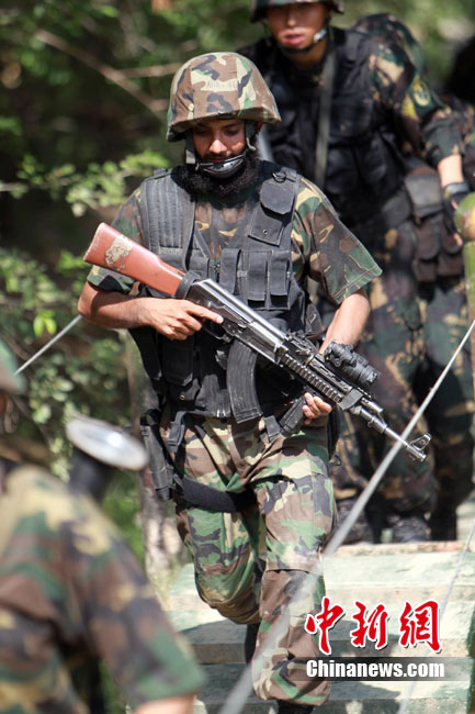7月5日,中巴兩軍特戰(zhàn)士兵展開(kāi)高強(qiáng)度魔鬼訓(xùn)練。此次代號(hào)為“友誼—2010”的中國(guó)巴基斯坦反恐聯(lián)合訓(xùn)練在中國(guó)寧夏青銅峽地區(qū)展開(kāi),訓(xùn)練主要以邊境地區(qū)山地聯(lián)合反恐作戰(zhàn)為課題,分為展示交流、混編同訓(xùn)、綜合演練三個(gè)階段。 中新社發(fā) 杜洋 攝