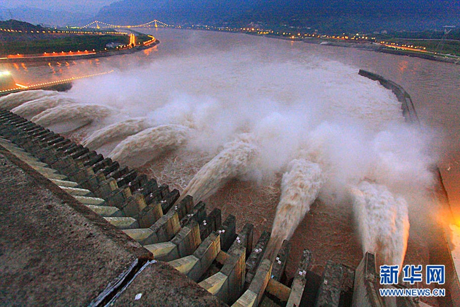 7月20日8時(shí),峰值為7萬(wàn)立方米/秒的洪水抵達(dá)三峽大壩。這是三峽工程建成后的首次大規(guī)模洪峰。大壩共開(kāi)啟9個(gè)泄洪深孔,將洪水下泄流量控制在4萬(wàn)立方米/秒左右,削減了4成多的洪峰下泄流量。中新社發(fā) 劉良偉 攝