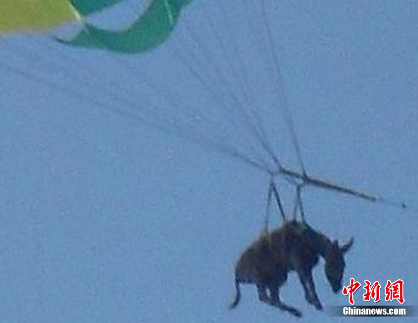俄羅斯警方于20日表示,上周在俄羅斯東部亞速海岸,游客及當?shù)孛癖姀恼克{的天空中看到了驚人的一幕:一頭身上綁著降落傘的毛驢正在天上繞著圈圈!(jù)稱,當時這頭毛驢因為驚恐,而破嗓大叫。