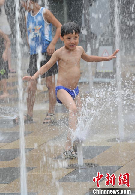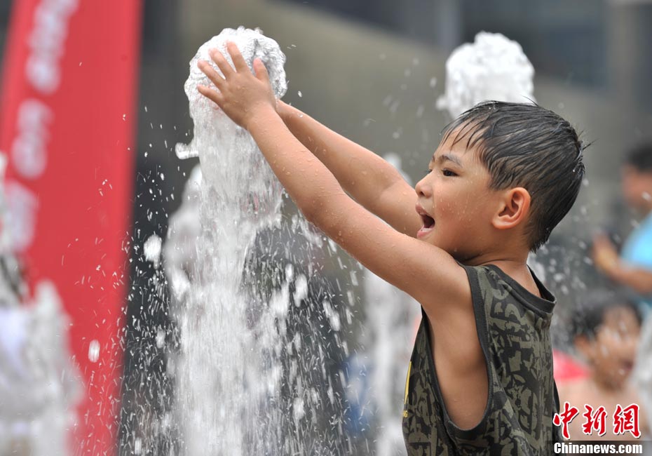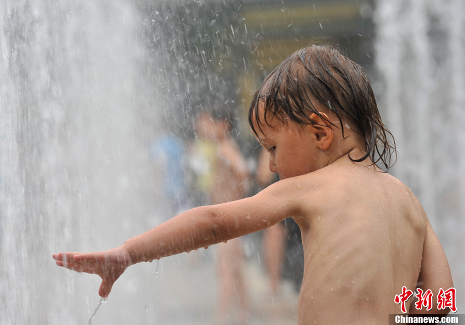 近日,北京持續(xù)的高溫使“桑拿天”的感覺(jué)越來(lái)越強(qiáng)烈。中央氣象臺(tái)繼續(xù)發(fā)布高溫藍(lán)色預(yù)警,預(yù)計(jì)未來(lái)三天,新疆吐魯番盆地和南疆盆地、甘肅西部、內(nèi)蒙古大部有35-37℃的高溫天氣,新疆吐魯番盆地、內(nèi)蒙古中西部的部分地區(qū)最高氣溫可達(dá)42℃以上;陜西東北部、山西北部、河北中西部、北京大部、天津西部、重慶大部、江南中西部等地有35℃以上的高溫天氣,局地最高氣溫可達(dá)37~38℃。圖為7月26日北京三里屯一處噴泉引來(lái)許多中外小朋友戲水享清涼。中新網(wǎng)記者 金碩 攝