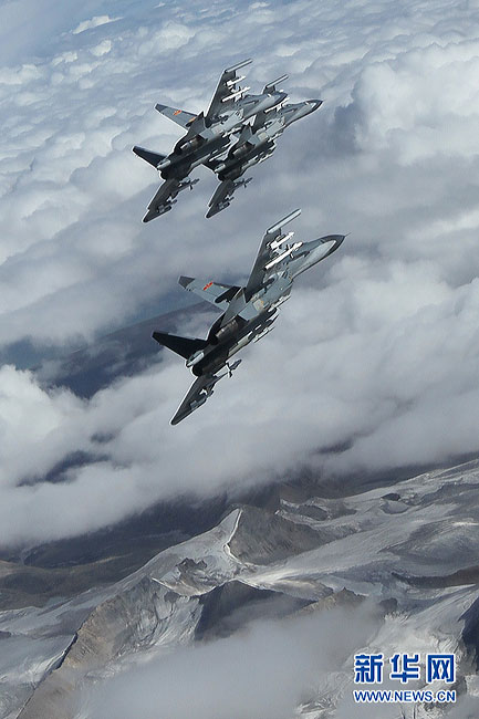 7月6日,戰(zhàn)機在青藏高原上空飛行。今年3月以來,成都軍區(qū)空軍某部在西藏進行第三代戰(zhàn)機攜實彈高原訓(xùn)練,組織戰(zhàn)機進行高原條件下的復(fù)雜氣象飛行、戰(zhàn)術(shù)戰(zhàn)法探索飛行以及極限性能檢測飛行等訓(xùn)練。劉應(yīng)華 攝