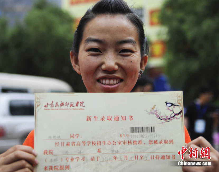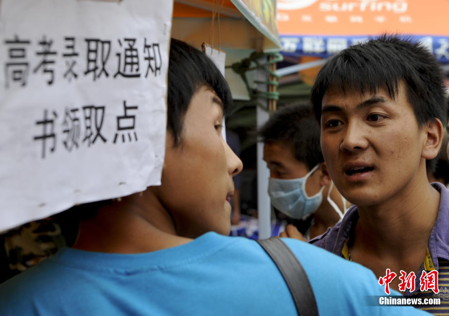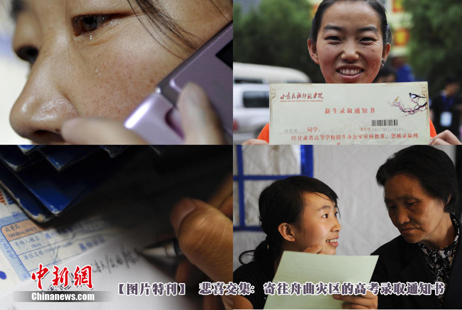 8月14日,甘肅舟曲災區(qū)的高考錄取通知書正在發(fā)放過程中,學生們接過火紅色的錄取通知書信封,眼里有藏不住的笑意。然而,有一些通知書卻永遠無法發(fā)出了。截至上午10點30分,舟曲一中收發(fā)室當天共發(fā)出7份錄取通知書,還有30多封正等待領取。中新社發(fā) 廖攀 攝
