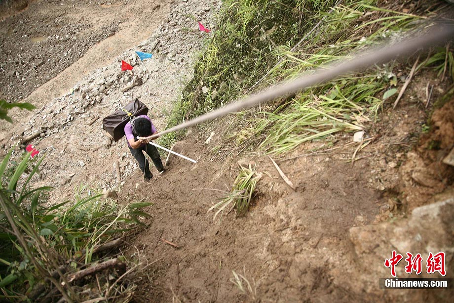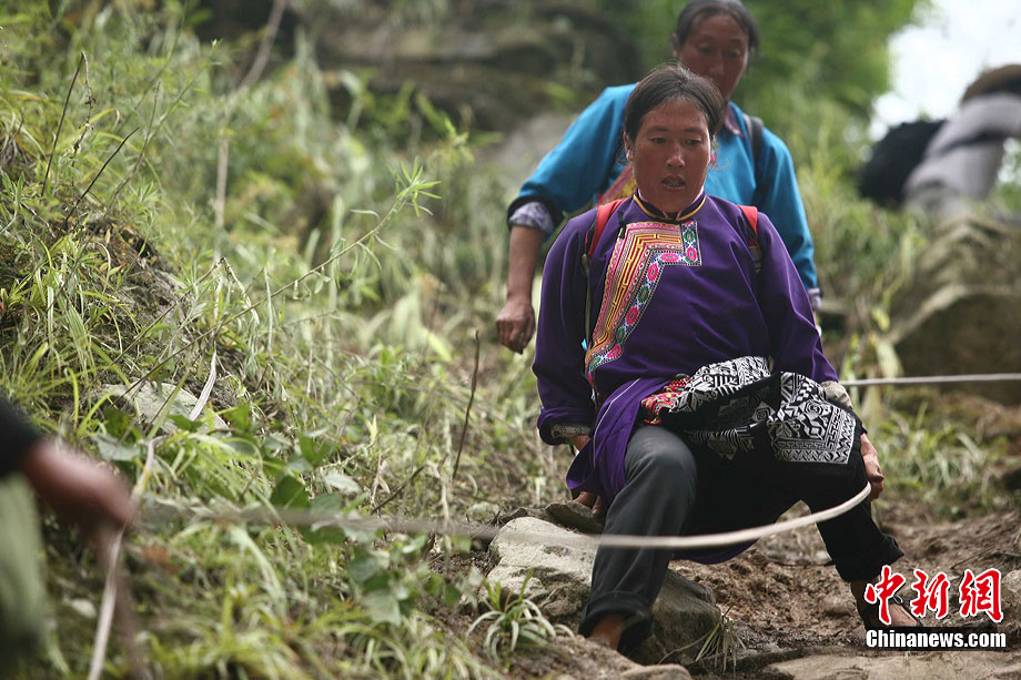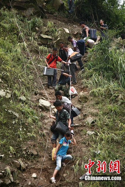 8月18日,汶川地區(qū)普降暴雨,岷江河水位再度上漲,由于汶川境內(nèi)213國道仍然處于中斷狀態(tài),受災(zāi)群眾依然只能徒步翻山越嶺撤離家園,部分山勢陡峭,群眾只能靠繩索通往。中新社發(fā) 張浪 攝