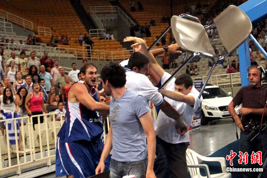 8月19日,在希臘舉行的雅典衛(wèi)城籃球四國(guó)賽中,塞爾維亞隊(duì)與希臘隊(duì)爆發(fā)沖突,裁判提前宣布比賽結(jié)束。圖為塞爾維亞隊(duì)球員克爾斯蒂奇(左)將椅子扔向希臘隊(duì)球員布魯西斯。