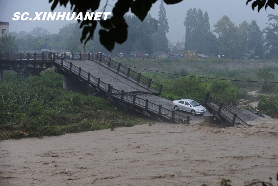 8月19日晚10時許,洪峰再次通過汶川縣映秀鎮(zhèn),突如其來的洪峰沖垮了映秀鎮(zhèn)堰塞體旁的防護欄,造成該段岷江水位下降,湍急的水流轉(zhuǎn)向沖刷映秀鎮(zhèn)新城河堤,搶險隊已用裝有石料的鐵絲網(wǎng)圍住河堤以保護映秀鎮(zhèn)新城。圖為已沖毀的岷江防護欄。中新社發(fā) 張浪 攝