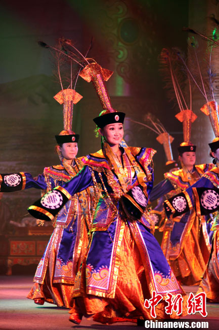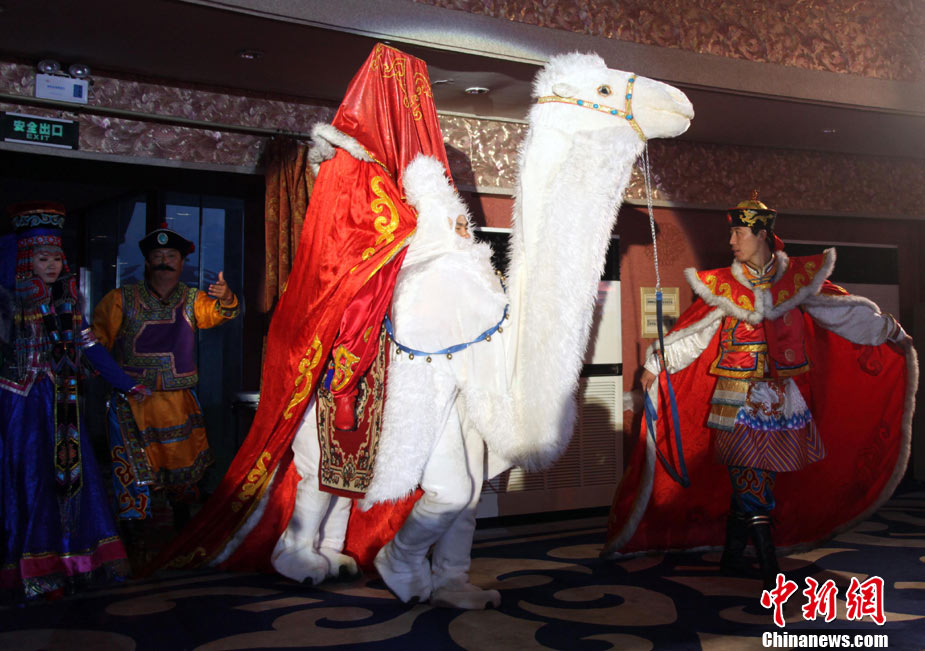 8月25日晚,參加“鄂爾多斯青銅器與早期東西方文化交流——北方草原通道”國際學(xué)術(shù)研討會的近百位中外考古學(xué)家,觀賞蒙古族傳統(tǒng)婚禮。圖為英國劍橋大學(xué)馬丁·瓊斯教授(右)、倫敦大學(xué)大衛(wèi)·哈里斯教授擔(dān)任婚禮主婚人,并應(yīng)邀掀開新娘子的紅蓋頭。中新社記者 孫自法 攝