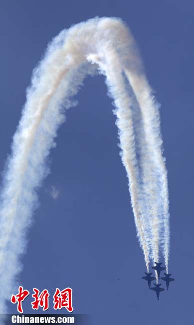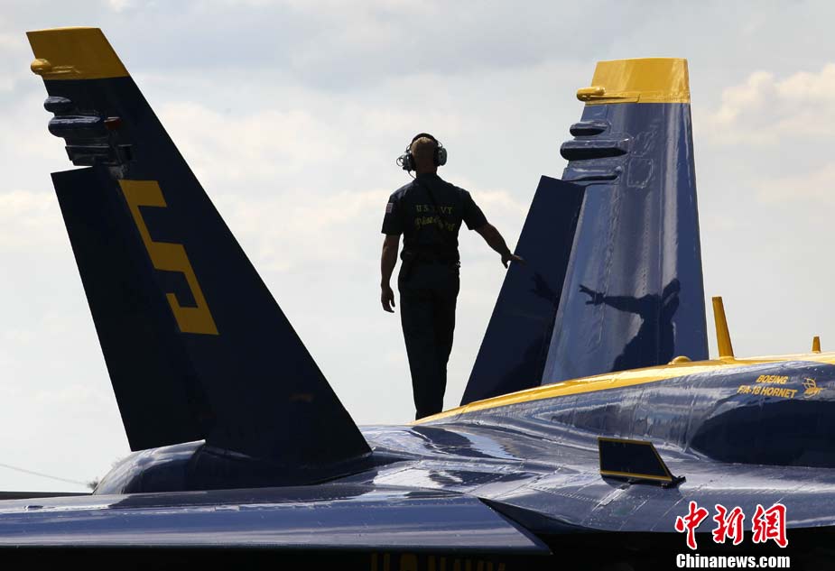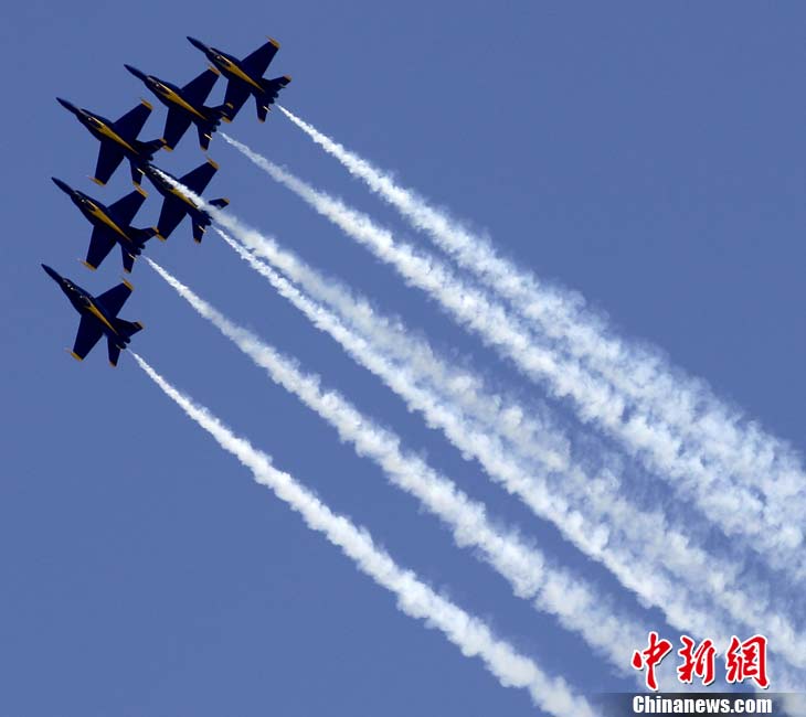 當地時間9月3日,美國“藍色天使”飛行表演隊為準備克利夫蘭航展進行空中特技表演練習。