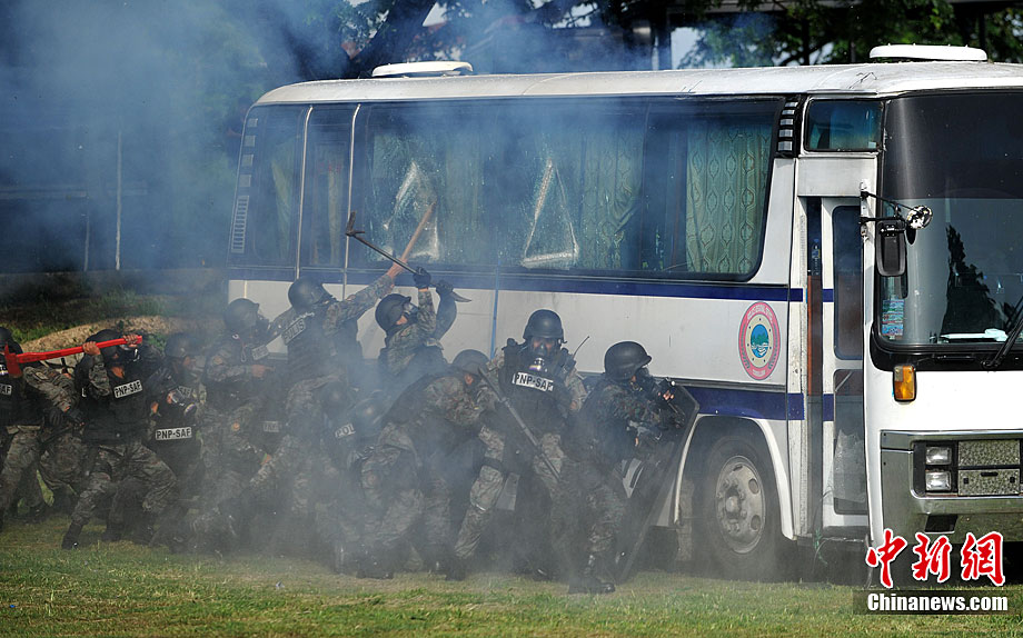 當?shù)貢r間9月9日,菲律賓警察特別行動部隊成員在菲律賓首都馬尼拉附近的營地舉行了人質救援演習。菲律賓總統(tǒng)阿基諾三世親自前往觀看該救援演習。