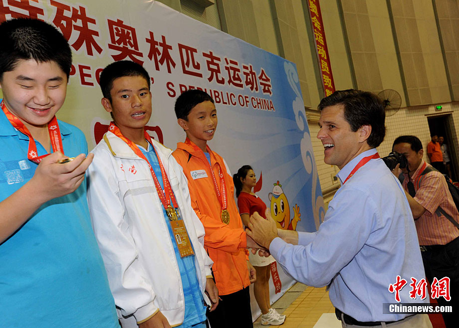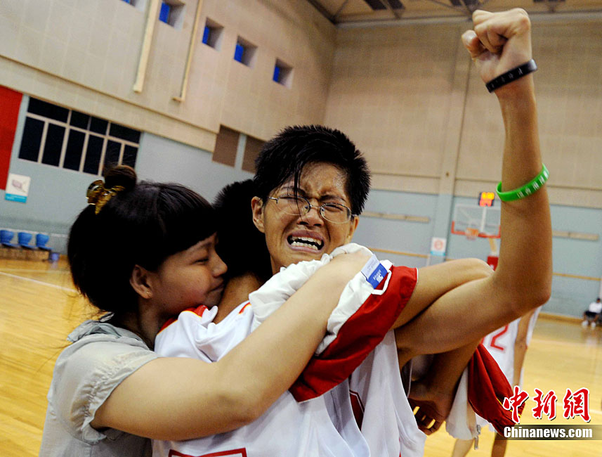 9月24日,在本屆特奧運(yùn)動(dòng)會(huì)男子籃球C組決賽中,福建一團(tuán)力克對(duì)手獲得冠軍。圖為比賽結(jié)束后福建一團(tuán)特奧籃球運(yùn)動(dòng)員張華閩、張華粵雙胞胎兄弟與一旁觀(guān)賽的母親唐秀玲相擁而泣,場(chǎng)面感人。劉可耕 攝
