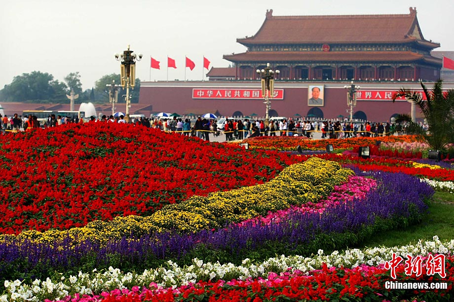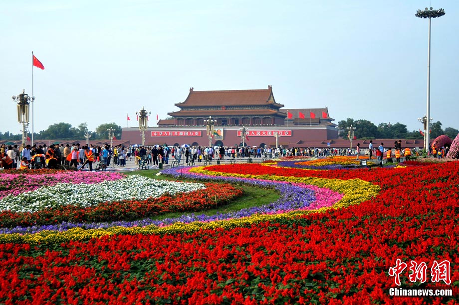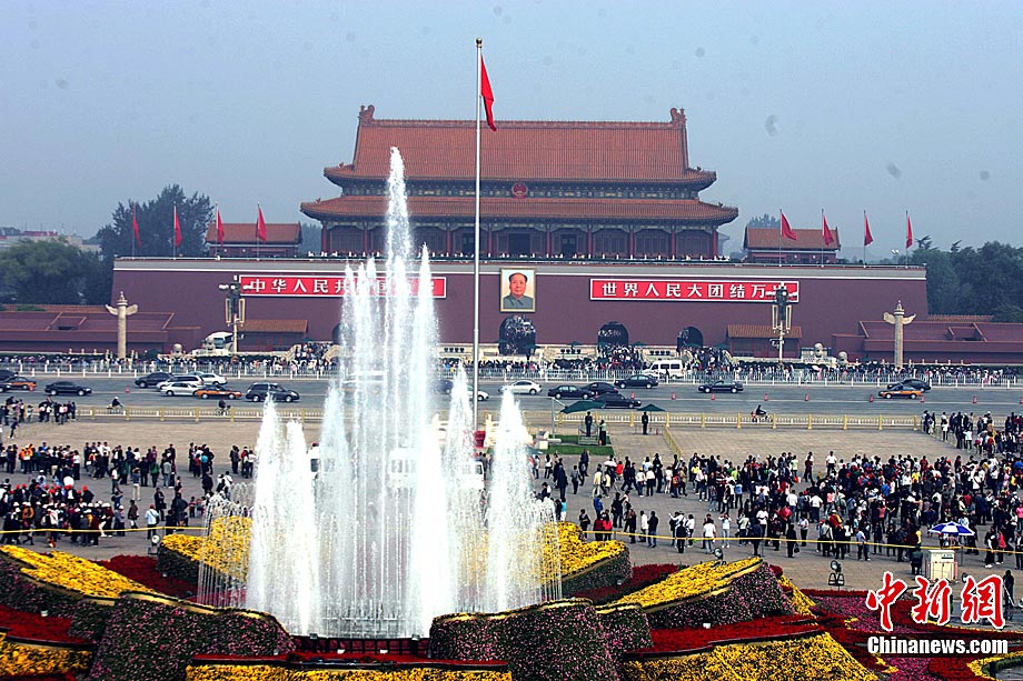9月25日上午,北京市園林綠化局宣傳中心對外宣布,為了迎接建國61周年,天安門廣場主題為“花開盛世”的中心水法花壇已經安裝完畢并正式亮相。吳間道 攝 圖片來源:cnsphoto