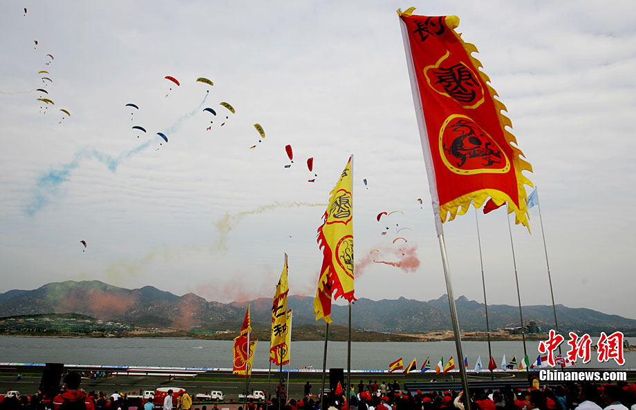 9月25日下午,2010中國國際航空體育節(jié)在山東省萊蕪市雪野旅游區(qū)拉開帷幕。來自世界18個國家的700余名航空體育高手匯聚“航空運動之城”萊蕪,以天空為舞臺,奉獻(xiàn)了一場精彩的航空體育盛會。圖為三角翼飛行器當(dāng)空舞彩練。 中新社發(fā) 馬圣泉 攝