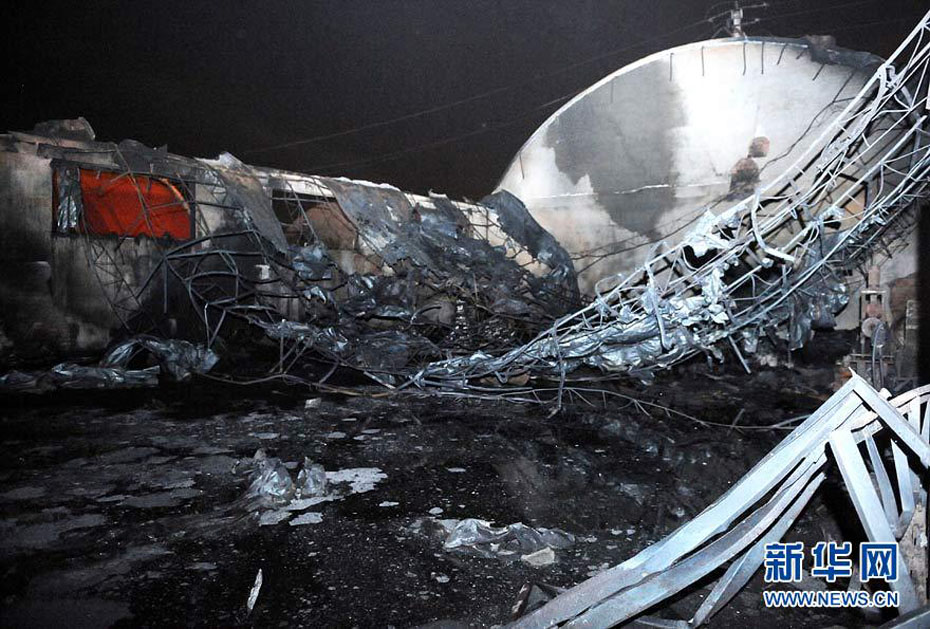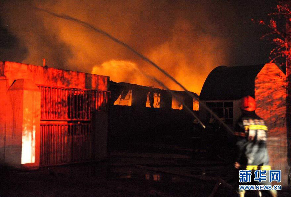 9月25日,消防官兵在火災(zāi)現(xiàn)場(chǎng)進(jìn)行撲救。當(dāng)日晚間,烏魯木齊國(guó)際機(jī)場(chǎng)跑道東側(cè)圍墻外一家“恒利擠塑板廠”發(fā)生火災(zāi)并有爆炸,由于有爆炸物散落到機(jī)場(chǎng)跑道,烏魯木齊國(guó)際機(jī)場(chǎng)關(guān)閉了一個(gè)小時(shí),清理跑道。圖片來源:新華網(wǎng) 王菲 攝