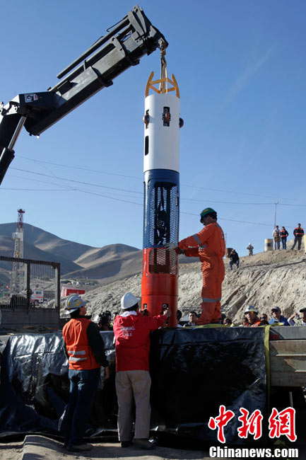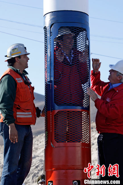 被困礦工的家屬在現(xiàn)場第一時間見到了救生艙,他們高興的鼓起掌來。這個救生艙重約420公斤,被命名為“鳳凰艙”,寓意著礦工們將依靠它重獲新生。救生艙身被涂成紅白藍3種顏色,這是智利國旗的顏色。艙內(nèi)高度為1.9米。另據(jù)悉,這個子彈形的救生艙還備有氧氣瓶、逃生裝置和通訊設(shè)備等。