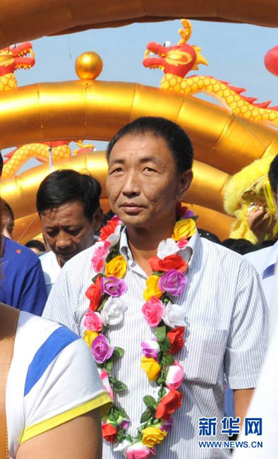 9月27日,被日方非法抓扣的中國漁船船長詹其雄返回家鄉(xiāng)--福建晉江市深滬鎮(zhèn)港滬村。當(dāng)?shù)剜l(xiāng)親熱情迎接他歸來。圖為詹其雄(圖中)下車后笑容滿面,受到了當(dāng)?shù)孛癖姷臒崃覛g迎。中新社發(fā) 孫虹 攝