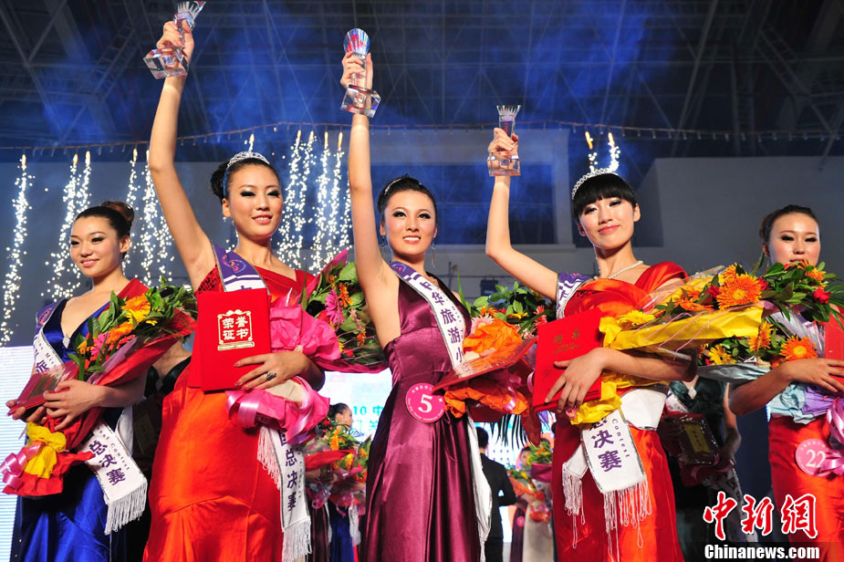 9月26日晚,2010中華旅游小姐大賽中國總決賽暨劍門關(guān)旅游形象大使選拔賽在四川省劍閣縣落下帷幕。40名佳麗們先后通過了熱情奔放的活力裝展示、風(fēng)情萬種的泳裝展示、雍容典雅的晚禮裝展示以及才藝表演、休閑裝展示后,經(jīng)評委們認(rèn)真評判,最終本賽季8個單項獎、十佳選手以及佳麗三甲相繼產(chǎn)生。王子星、李彤、許亞楠分獲冠、亞、季軍,并獲得劍門關(guān)旅游形象大使的殊榮。中新社記者 李學(xué)仕 攝