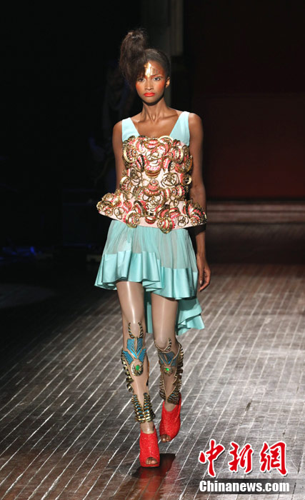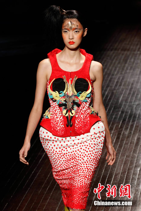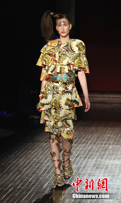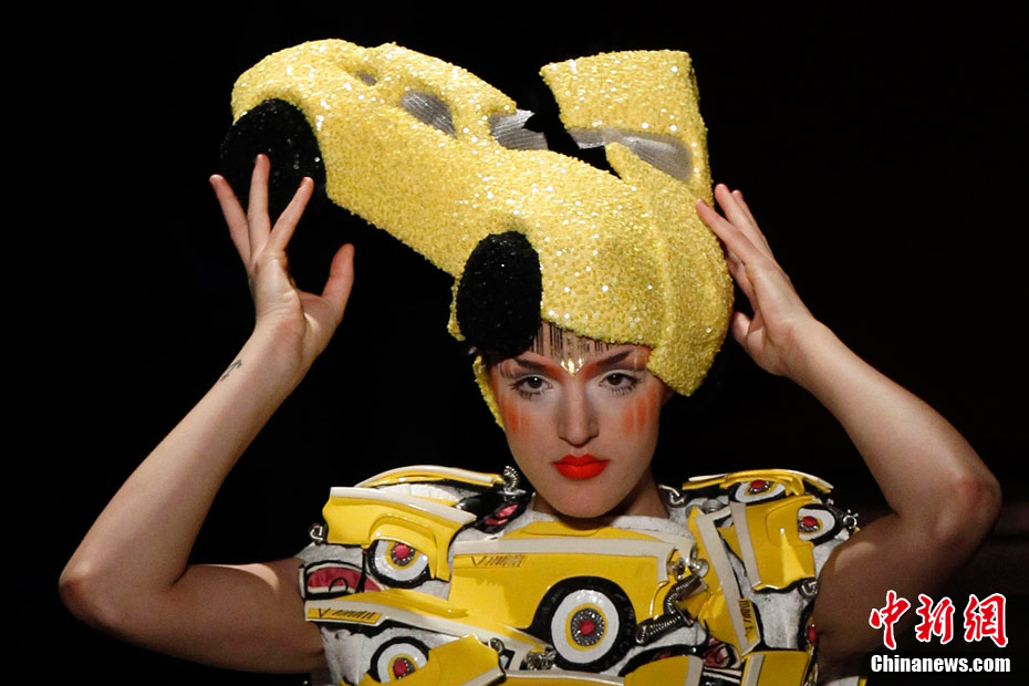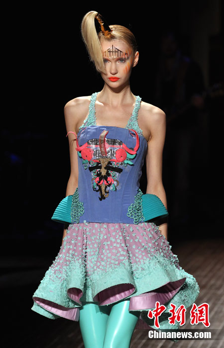 9月30日,巴黎時裝周上,模特在展示印度設(shè)計師曼尼詩·阿羅拉(Manish Arora)的作品。大膽鮮艷的另類風(fēng)格,讓人耳目一新。