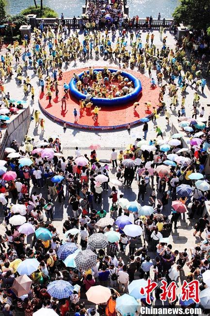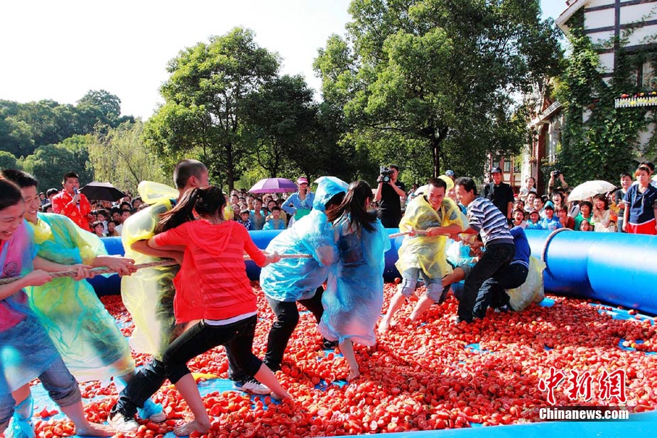 10月6日,艷陽(yáng)高照的長(zhǎng)沙世界之窗公園里,一群身著雨衣的年輕人在鋪滿西紅柿的池子里玩老鷹抓小雞的游戲,場(chǎng)面滑稽而激烈。國(guó)慶節(jié)期間,每天都有數(shù)千游客來(lái)這里參與“西紅柿大戰(zhàn)”,他們或用西紅柿互相“攻擊”,或玩拔河、老鷹抓小雞等游戲,盡情歡樂(lè)。中新社記者 肖前輝 攝