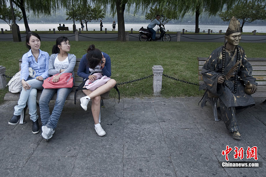 2010年10月上旬,一名打扮成濟(jì)公模樣的人在浙江省杭州市西湖白堤和游客合影,“濟(jì)公”身上涂滿(mǎn)了銅顏色的彩繪,看上去像雕塑一樣。據(jù)悉,這位20多歲“濟(jì)公”來(lái)自江蘇,從今年春天開(kāi)始扮成“濟(jì)公”,在全國(guó)游走。和他合影需要交5元錢(qián)。許康平 攝 圖片來(lái)源:cnsphoto