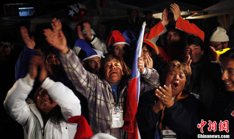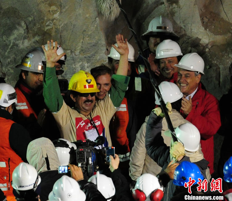 智利首名升井礦工弗洛倫西奧•阿瓦洛斯(Florencio Avalos)北京時間13日上午11點10分左右搭乘特制救生艙回到地面,成功獲救。目前,救援工作成功邁出第一步,救生艙接下來將繼續(xù)放入井下,營救其余32名被困礦工。圖為阿瓦洛斯出井后與智利總統(tǒng)皮涅拉擁抱。