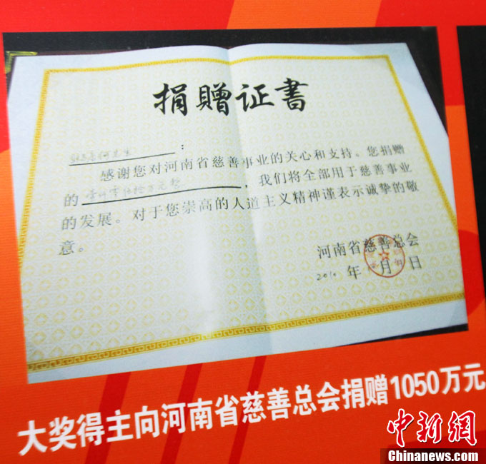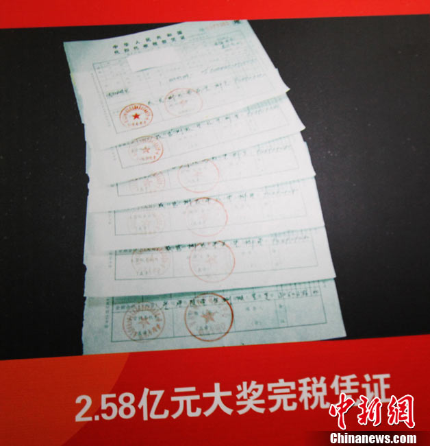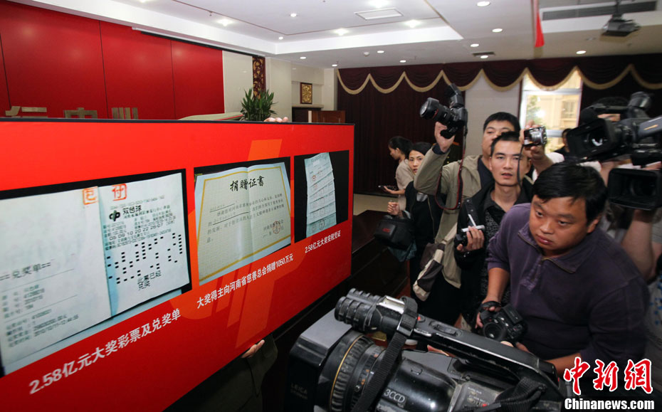 10月13日,河南福彩中心召開新聞發(fā)布會(huì)通報(bào)雙色球2.58億兌獎(jiǎng)情況,2.58億巨獎(jiǎng)彩票在發(fā)布會(huì)上曝光。巨獎(jiǎng)于本周一被兌取,得主是一位長(zhǎng)期從事教育職業(yè)的駐馬店本地人,他的大獎(jiǎng)為機(jī)選1注后50倍投,他將捐款1050萬(wàn),為目前中國(guó)彩市大獎(jiǎng)得主單筆最高捐款。2.58億是繼2009年安陽(yáng)彩民獲3.59億后,河南彩民攬獲的又一個(gè)超級(jí)巨獎(jiǎng)。中新社記者 王中舉 攝