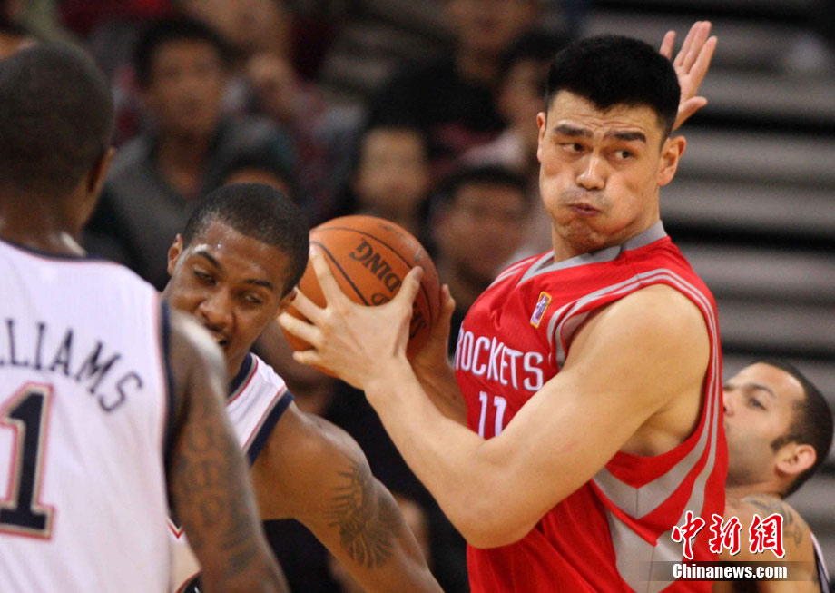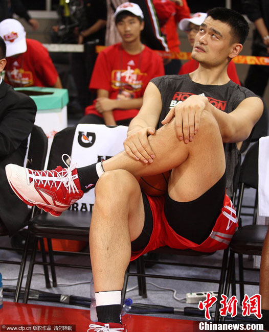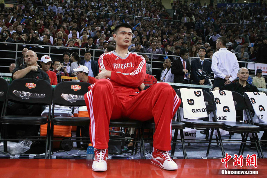 10月13日,NBA中國賽第一場(chǎng)比賽在北京五棵松體育館舉行,休斯敦火箭隊(duì)迎戰(zhàn)新澤西網(wǎng)隊(duì)。兩支球隊(duì)將于本月16日在廣州進(jìn)行第二場(chǎng)比賽。圖為姚明熱身后在場(chǎng)邊休息。圖片來源:CFP視覺中國