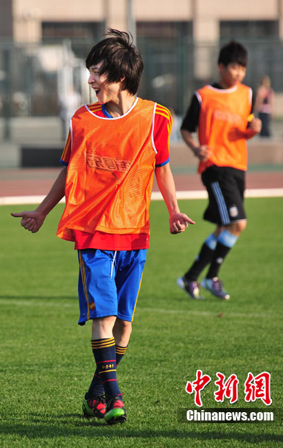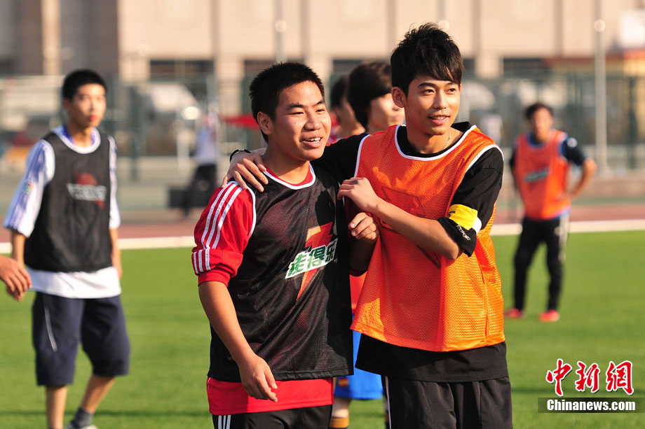 10月13日,“青春綻放”大學(xué)生音樂之旅大賽走進(jìn)北京大學(xué)舉行宣傳活動(dòng)。蘇醒、王嘯坤、王錚亮等潮流歌手組成明星足球隊(duì),與北大學(xué)子們?cè)诰G茵場(chǎng)上切磋球技,揮灑青春熱情。據(jù)悉,“青春綻放”大學(xué)生音樂之旅大型音樂人才選拔活動(dòng)已進(jìn)入高校宣傳階段,將陸續(xù)走進(jìn)清華大學(xué),首都師范大學(xué),中央民族大學(xué)等十多所高校,鼓勵(lì)更多的大學(xué)生參賽,展現(xiàn)青春自我。圖為蘇醒帶球突破。中新社記者 李學(xué)仕 攝