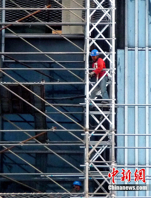 10月14日,北京央視新址,過火樓四周已開始搭起腳手架,更換外立面。與此同時(shí),施工方已開始拆除被燒毀的合成玻璃,下月起全部更換。2009年元宵節(jié),未交工的央視新址北配樓曾燃大火,2010年8月該樓開始啟動(dòng)整修。祥云 攝 圖片來源:cnsphoto