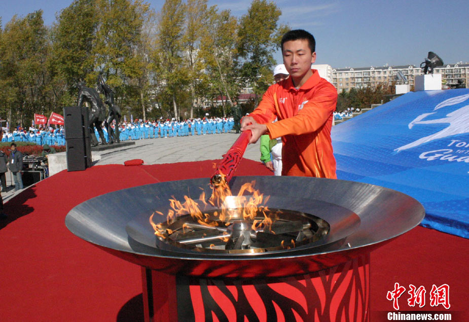 10月15日,第16屆廣州亞運會火炬在吉林省長春市進行展示性傳遞,這是本屆亞運會火炬?zhèn)鬟f在廣東省外的第二站。16名火炬手在長春世界雕塑公園沿公園北側(cè)環(huán)路完成16棒傳遞,5000余名熱情的長春市民現(xiàn)場見證了這一時刻。圖為最后一棒火炬手點燃圣火盆。中新社發(fā) 田偉 攝