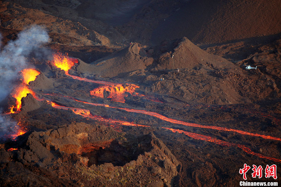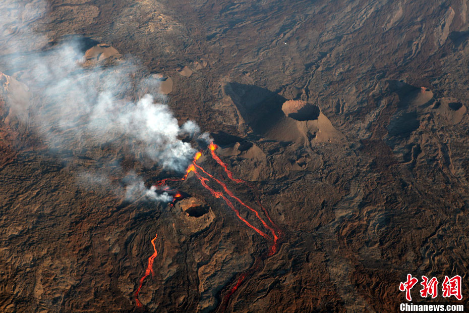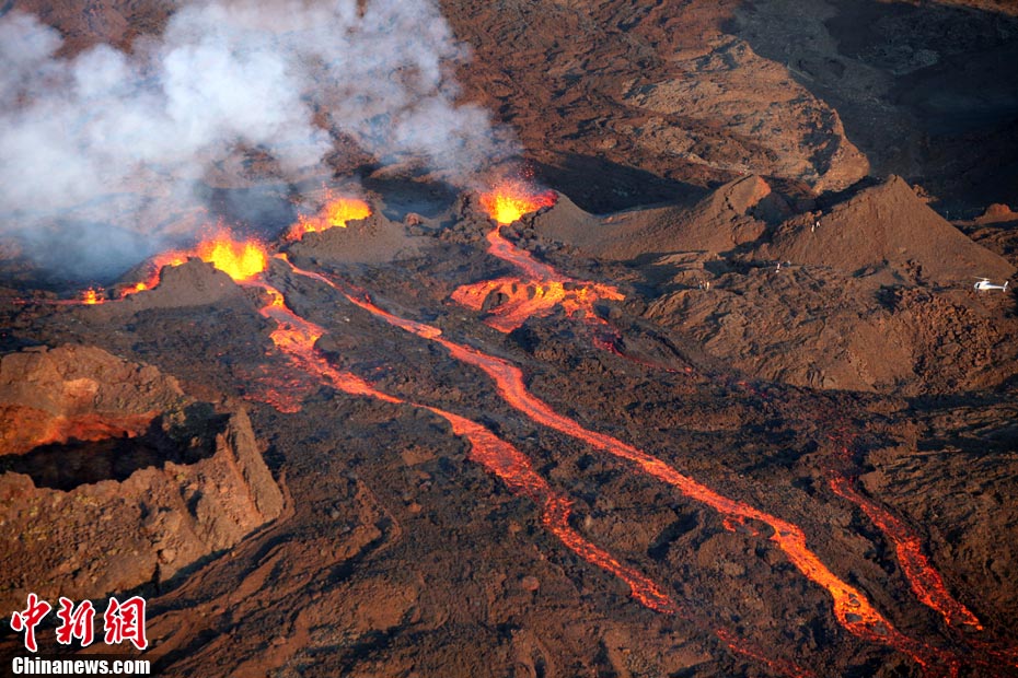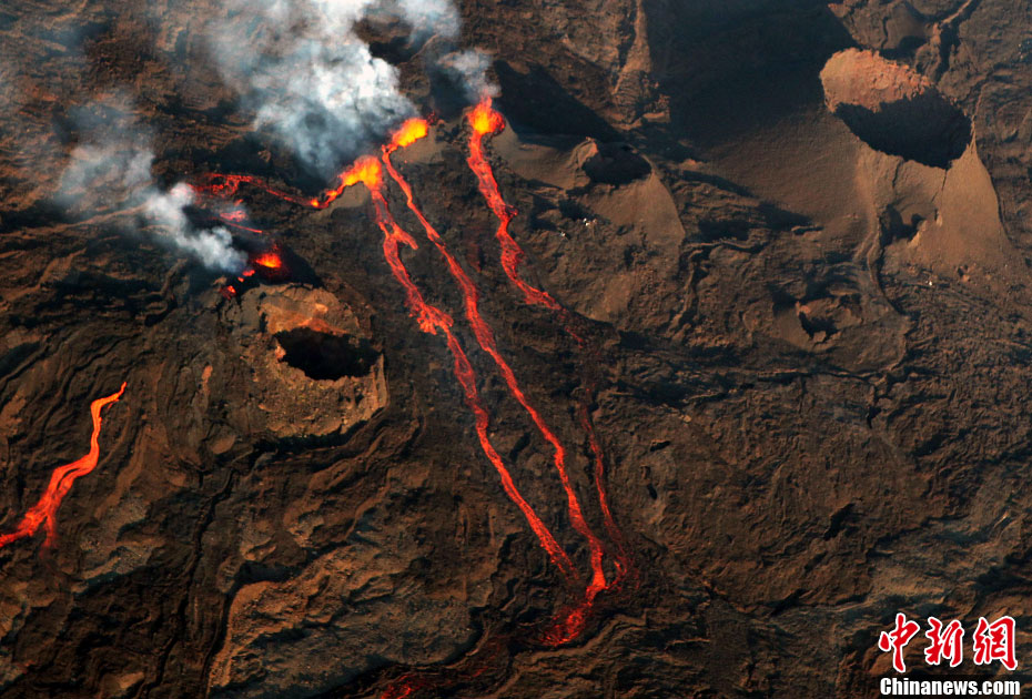 2010年10月14日,法國(guó)留尼旺島上的弗爾乃斯火山(Piton de la Fournaise)開(kāi)始噴發(fā)熔巖流。圖為鳥(niǎo)瞰該火山噴發(fā)出的熔巖流。位于印度洋西南部的弗爾乃斯火山是世界上最活躍的活火山之一。