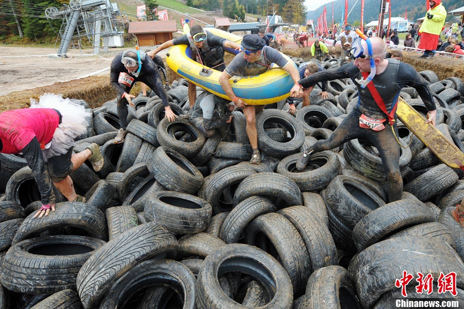 當?shù)貢r間2010年10月17日,法國東部布雷斯(La Bresse)人們參加漁夫“狂奔”跑步大賽。