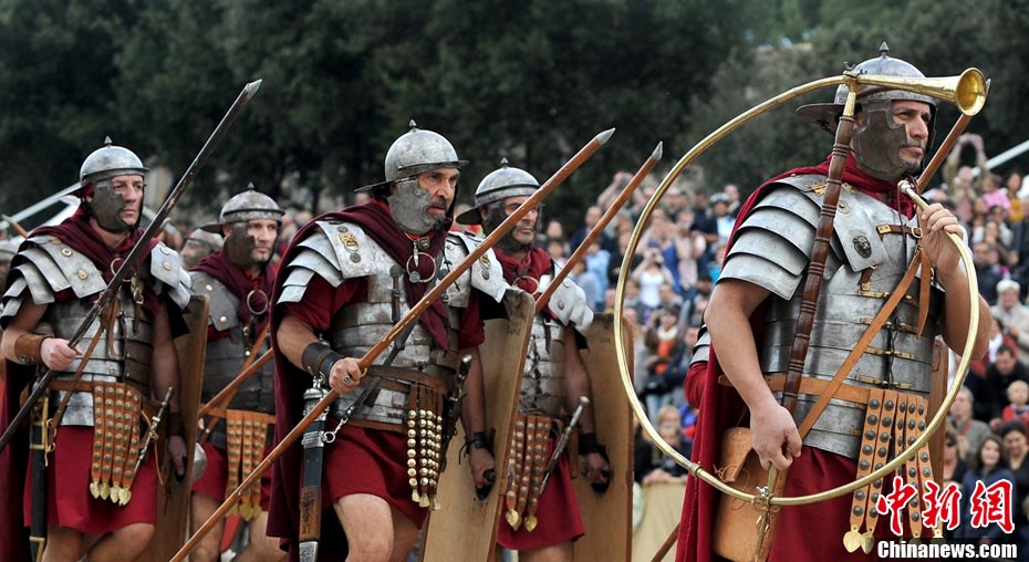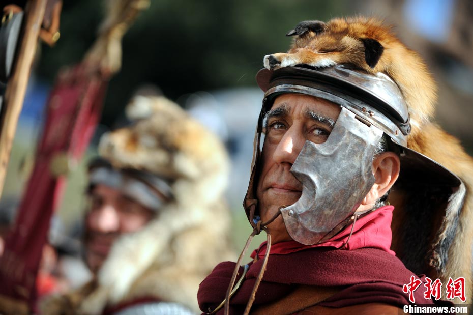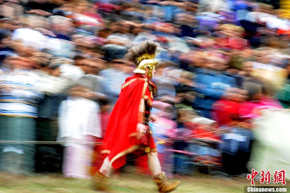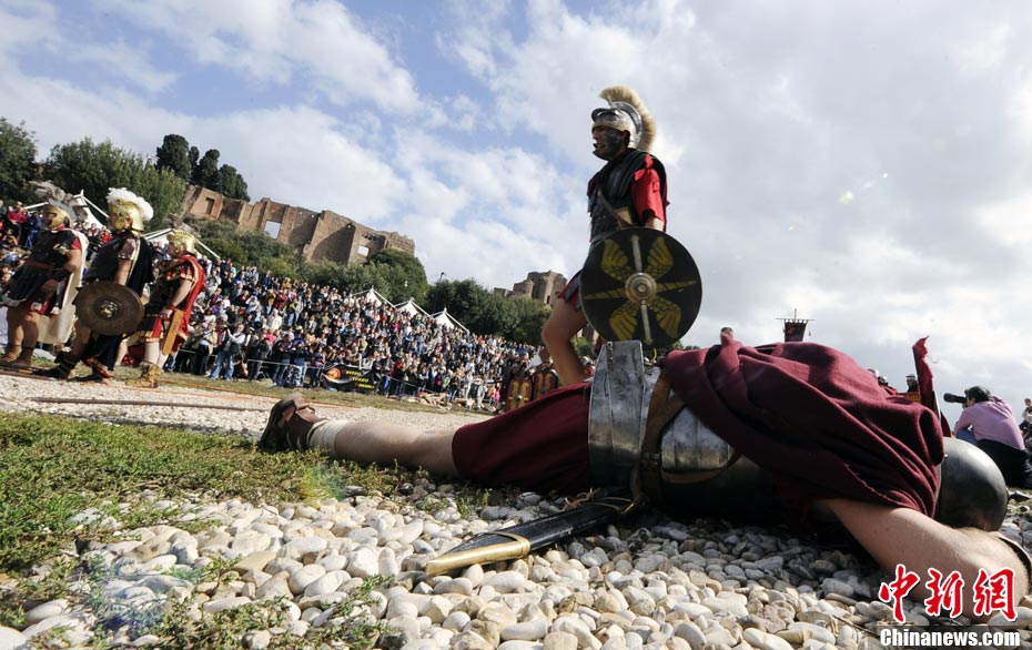 當?shù)貢r間2010年10月17日,意大利羅馬的歷史愛好者和演員們再現(xiàn)了“古羅馬軍團”和凱爾特人戰(zhàn)斗的場景,表演吸引了大批觀眾到場觀看。