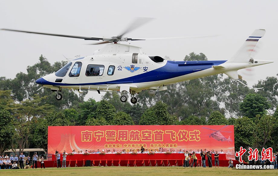 10月18日,南寧警用直升機(jī)首飛儀式在南寧青秀山舉行,這是南寧首架也是中國(guó)西南首架警用直升機(jī)。該機(jī)最大速度每小時(shí)311千米,最大航程是977千米,最大起飛重量是3000千克,駕駛艙可乘坐2名飛行員,客艙內(nèi)放置有一個(gè)工作臺(tái)和5個(gè)乘客座椅,續(xù)航時(shí)間為4小時(shí),是意大利阿古斯特-韋斯特蘭公司生產(chǎn)的A109E輕型雙發(fā)直升機(jī)。據(jù)悉,這是據(jù)廣州、北京、上海后,第四個(gè)擁有警用直升機(jī)的城市。圖片來(lái)源:cnsphoto loniya 攝