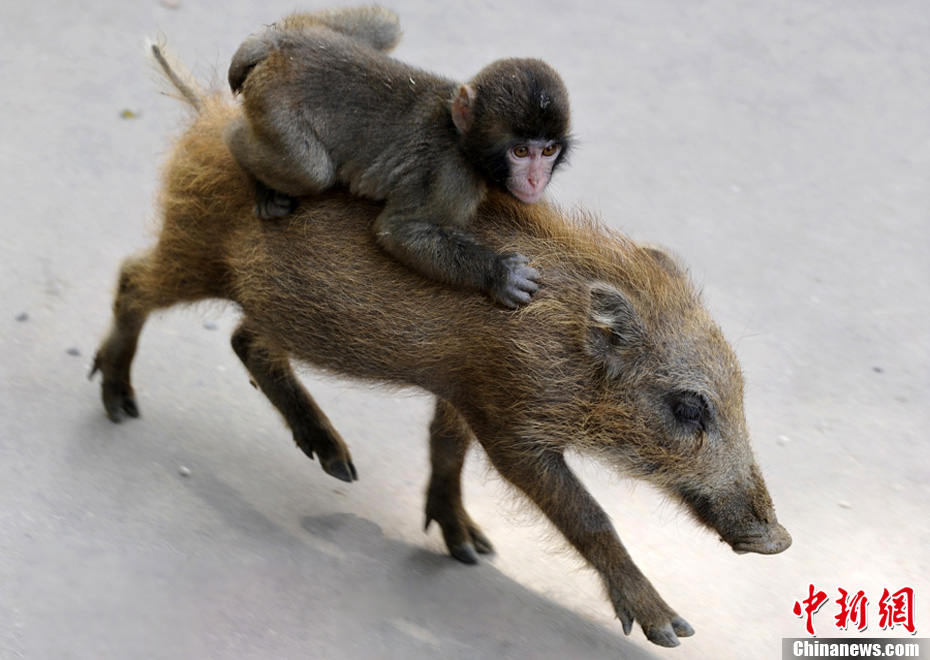 10月19日,日本京都轄區(qū)內(nèi)的福知山動(dòng)物園里,兩只小動(dòng)物成了大家眼中的明星:名叫Uribo的小公野豬經(jīng)常馱著小猴子Miwa跑來(lái)跑去,吸引大量游客前來(lái)觀看,并且給它們拍照。他們都是失去了母親的孤兒,福知山動(dòng)物園將他們收養(yǎng)。