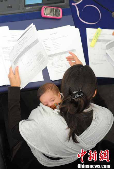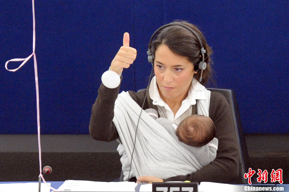 10月20日,歐洲議會在法國的斯特拉斯堡為延長產(chǎn)假的提案舉行投票,代表麗希亞·隆蘇依帶著孩子出席會議。