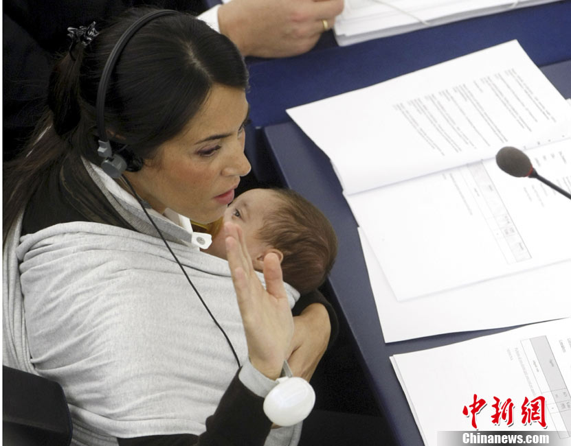 10月20日,歐洲議會(huì)在法國(guó)的斯特拉斯堡為延長(zhǎng)產(chǎn)假的提案舉行投票,代表麗希亞·隆蘇依帶著孩子出席會(huì)議。