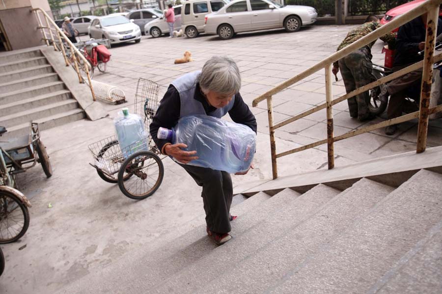 年至七旬的高美運,為了糊養(yǎng)全家、為兒孫治病,每天都要重復(fù)這個動作近百次。40斤的水桶在這個只有75斤的老人面前,實在是太沉了。為了養(yǎng)活身殘的兒子和智障的孫子,七十歲的老人高美運獨自扛起了養(yǎng)活一家人的重擔(dān)。為了生計,她開了一家水站,成了石景山區(qū)楊莊中區(qū)社區(qū)里有名的“送水老太太”。