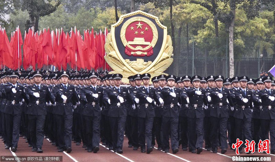 2010年10月20日,中國(guó)人民公安大學(xué)新生開(kāi)學(xué)儀式在北京大興校區(qū)舉行,數(shù)百位家長(zhǎng)親臨現(xiàn)場(chǎng),觀摩了孩子們?cè)陂_(kāi)學(xué)典禮上的表演。圖為女生們表演匕首制敵的招數(shù)。蒲東峰 攝 圖片來(lái)源:CFP視覺(jué)中國(guó)