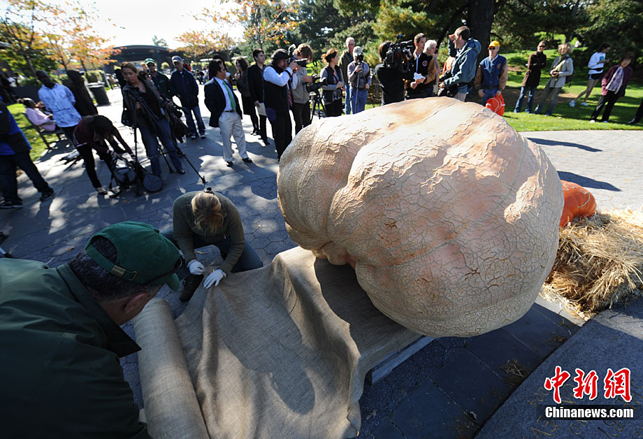 當(dāng)?shù)貢r間10月21日,世界上大個頭南瓜在美國紐約植物園里集體亮相展示,其中包括剛打破世界紀(jì)錄重達(dá)821.2公斤的“新科狀元”。